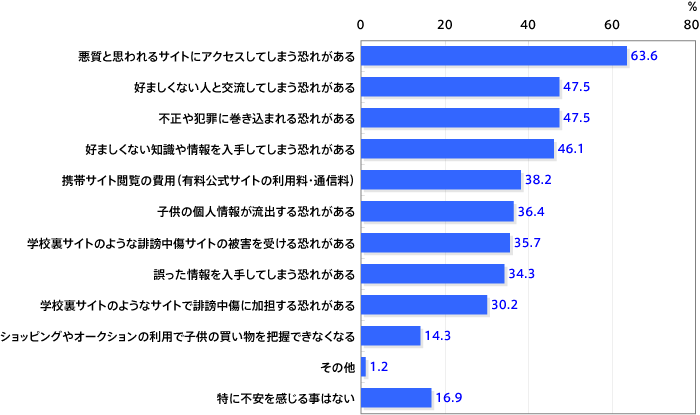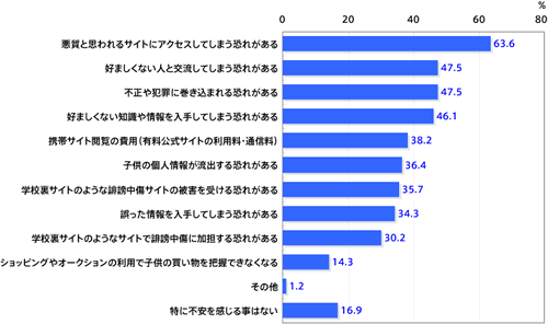 保護者に、子供が携帯サイトを閲覧する上で不安に思っていることを尋ねたところ、「悪質と思われるサイトにアクセスしてしまう恐れがある」(64%)が最も多く、次いで「好ましくない人と交流してしまう恐れがある」(48%)、「不正や犯罪に巻き込まれる恐れがある」(48%)となりました。