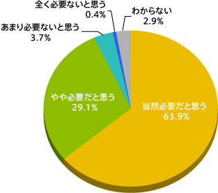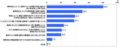 保護者に、携帯会社が取り組んでいるフィルタリングサービスの必要性を尋ねたところ、「当然必用だと思う」(64%)、「やや必用だと思う」(29%)となり、合計すると9割以上の保護者がフィルタリングサービスに賛成のようです。さらに、フィルタリングサービスに関する考えを尋ねたところ、81%の保護者が携帯会社の有害サイトを制限する取組みに対して望ましいと回答、フィルタリングサービスへの保護者の期待を窺わせます。一方、サイト閲覧制限の基準提示、年齢毎に制限基準を設けることの必要性、消費者へ説明に関して約4割の保護者は問題意識を持っていることがわかりました。