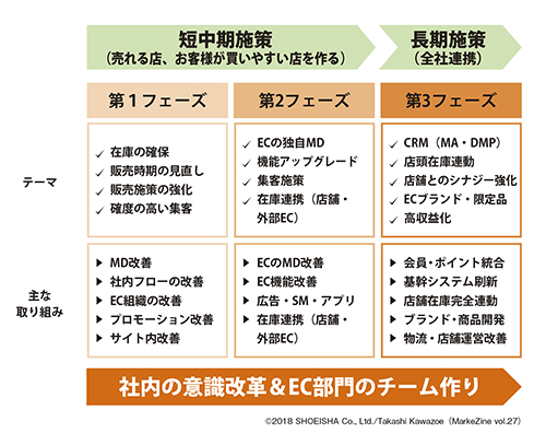 前半で紹介した5ステップでは、(4)にテクノロジーの活用を挙げましたが、直近の自社EC拡大や、店舗との連携などにもシステムの話は関わってきます。ここでは、自社ECの成長を主体として見たときの短期施策から長期的な全社施策を含めて、システム開発のフェーズ分けを見てみます(図表2)。