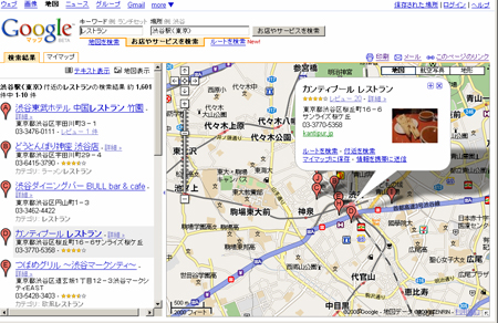たとえば「渋谷 ファーストフード」と検索をすると渋谷駅を中心とした、ファーストフードのお店が地図とともにA~Jまで10件表示される。検索ユーザが地図内のアルファベットをクリックするとGoogleマップのページに遷移し、大きな地図が表示される。ここに自社の情報を表示するには、Googleローカルビジネスセンターへの登録が必要である。
