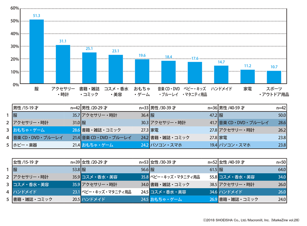 基本的にはファッションや趣味に関わる品目が多く購入されているが、女性20~30代は「ベビー・キッズ・マタニティ用品」「おもちゃ・ゲーム」など、育児に必要となるモノをフリマアプリで買い揃えているのも特徴的である。