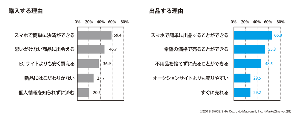 まず、購入理由から見ると「スマホで簡単に決済ができる」「思いがけない商品に出会える」「ECサイトよりも安く買える」という理由が上位に挙がった。一方、出品理由の上位は、「スマホで簡単に出品することができる」「希望の価格で売ることができる」「不用品を捨てずに売ることができる」であった。
