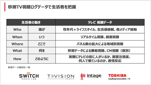 メディアから得られるデータを使い、生活者を理解することが重要になった今、テレビ視聴データについては視聴率以外のものも取れるようになってきた。視聴率はいつテレビを観ているかを定量化した指標であるが、それに加えて、性別や年代、地域、TVCM視聴の有無、何人で観ているかまで可視化できるという。