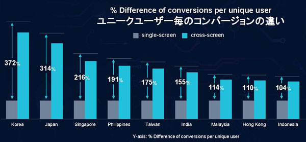 では、国によってクロスデバイスキャンペーンの成果に違いはあるのだろうか。アジア市場ではいずれの国でも単一デバイスの場合よりユニークユーザー毎のコンバージョンは高い結果となった。日本は2位にランクインしており、314%高いことがわかった。