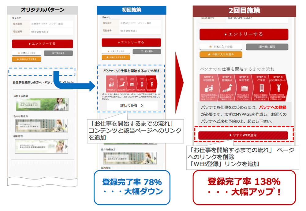 荒竹:ありがとうございます。これを踏まえて次の施策では「価値のある情報を見せたうえで、穴をふさぐ」ということをしました。具体的には「お仕事開始までの流れ」ページへ遷移するボタンを削除して、「お仕事開始までの流れ」のコンテンツを見たらすぐに次のアクションができるように「Web登録ボタン」に差し替えました。この施策が130%以上の改善に転じ、その他ヘッダーのリンク先を変更する施策などを積み重ね、3回のA/Bテストの累積で179%の改善という結果を出すことができました。