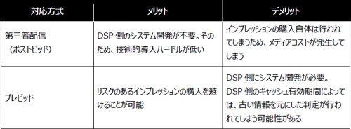 こうしたメリット、デメリットに加え、第三者配信とプレビッド方式ではベンダーごとに利用料金が発生するため、それらを含めてより目的にマッチするほうを選択すると良いでしょう。基本的には、本来不要なインプレッションを購入しないという意味で、プレビッド方式にてフィルター(リスクのあるインプレッションは購入しない)という対応が本質的だと思いますので、まずDSPプラットフォーマーにプレビッド方式でどのようなフィルターを使えるのか確認するのが、筆者としてはお勧めです。