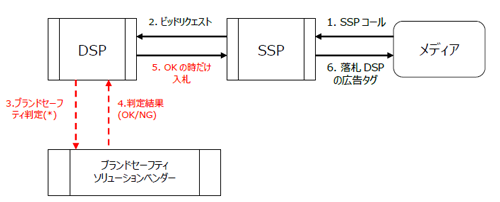 ※ブランドセーフティ判定を毎回ソリューションベンダーに問い合わせると、RTB入札のタイムアウトを誘発するため、DSPプラットフォーム側に判定結果を一定時間キャッシュし、キャッシュ有効期間内はソリューションベンダーへの問い合わせなしにキャッシュを再利用するケースが多い。