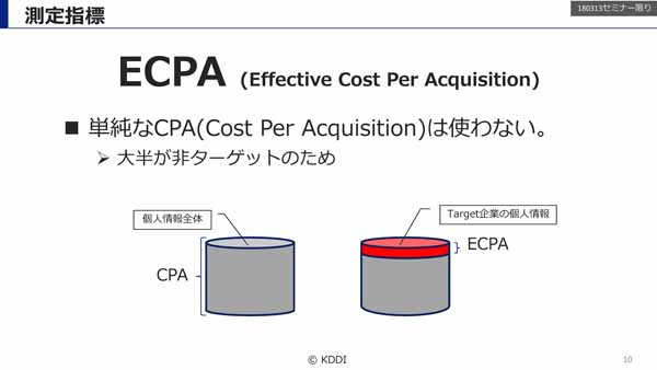 その中で特定の指標として「ECPA(Effective Cost Per Acquisition)」を活用していると明かす森本氏。個人情報を取得できればAcquisition(獲得)とみなすのではなく、「ターゲット企業の個人情報」のみをAcquisitionとみなすのだ。