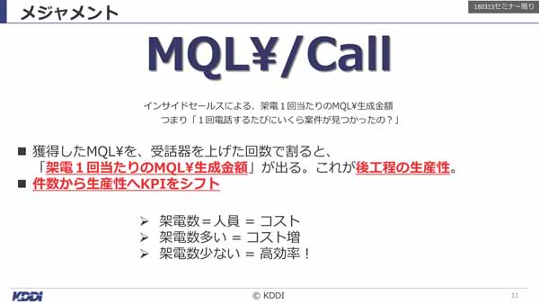 具体的には、KDDIではMQLをECPAの考え方でモニタリングしており「MQL\/Call」という指標を活用している。一回の架電でいくらのMQLを生み出せたかを金額ベースで見ていくことで、インサイドセールスの生産性を測るのだ。「架電数=人員=コスト」なので、一回の架電でより多くの金額に相当するMQLを生み出せれば、効率のいいマーケティングができていることになる。