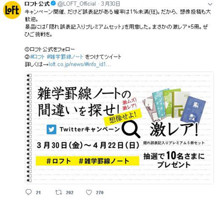 高橋:Twitterにて「雑学罫線ノートの間違いを探せ」キャンペーンを実施いたしました。キャンペーンの告知には、ツイッターのほか、自社アプリの「ロフトアプリ」での記事配信、ロフトホームページ、ロフトフェイスブック、店頭POPでも実施しました。また、キングジムさんの公式ツイッターでも絡んでいただきました。