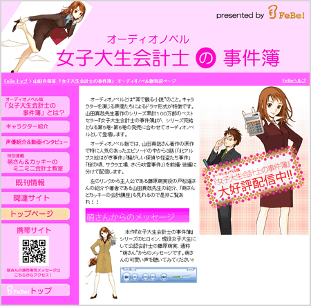 このように自社の開発力を活かしたサービスを展開しているオトバンクは、新刊のダイジェスト版を無料配信する「新刊JP」や、携帯向けの配信サービス「耳ヨミ」もスタート。現在NTTドコモの端末向けに公式サイトとして提供している「耳ヨミ」では、ケータイ小説の音声配信も予定している。また、メインのポータルサイト「FeBe」でも、シリーズ累計100万部のベストセラー『女子大生会計士の事件簿』を声優たちによるドラマ形式で再現したオーディオノベル版の提供を開始するなど、コンテンツの拡充にも力を入れている。