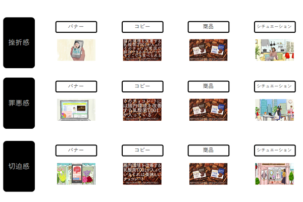 アテンションに関して補足すると、まずチョコレートのとろける様子を表現した「チョコシズル」、「食べたい」「でもガマン……」といった「心の声」、部屋や職場といった場を表す「シチュエーション」。そして、スマホやPCで広告バナーを見ているシーンを表した「バナー」もあります。また、乳酸菌ショコラのパッケージを見せる「商品」、機能を示した「コピー」と、合計6パターンを設定しました。