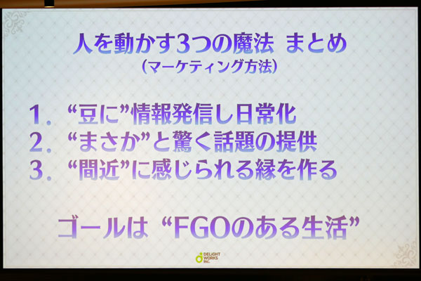「それらを駆使するマーケターとはいわば『魔法使い』です。FGOのある生活を5年、10年と長く続けていただけるよう、これからもお客様に楽しんでいただける様々な魔法をかけていきます」と、石倉氏は締めくくった。