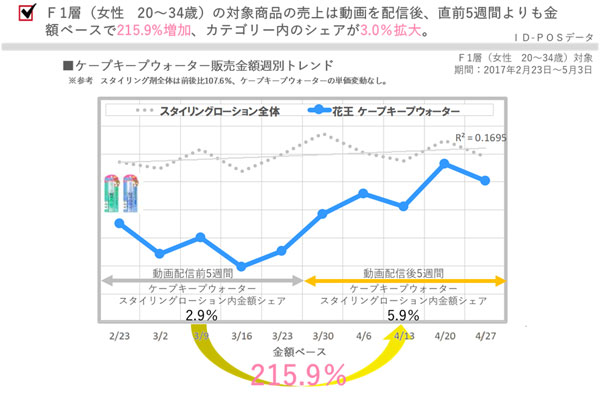 そして、分析対象顧客をF1層に絞った上で、全国の有力ドラッグストア300店舗のID-POSデータを活用し効果検証を行いました。その結果、F1層による対象商品の売り上げは、金額ベースで215.9%増加、商品カテゴリー内でのシェアは3.0%拡大したことがわかりました。
