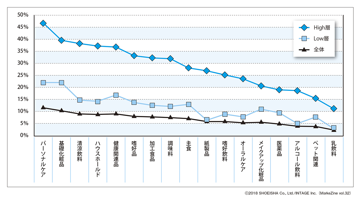 High層で購入率が高かったのは「パーソナルケア」「基礎化粧品」「清涼飲料」「ハウスホールド」「健康関連品」という順でした。こだわりの日用雑貨を買ったり、水をまとめ買いしたりといった傾向が浮かんできます。