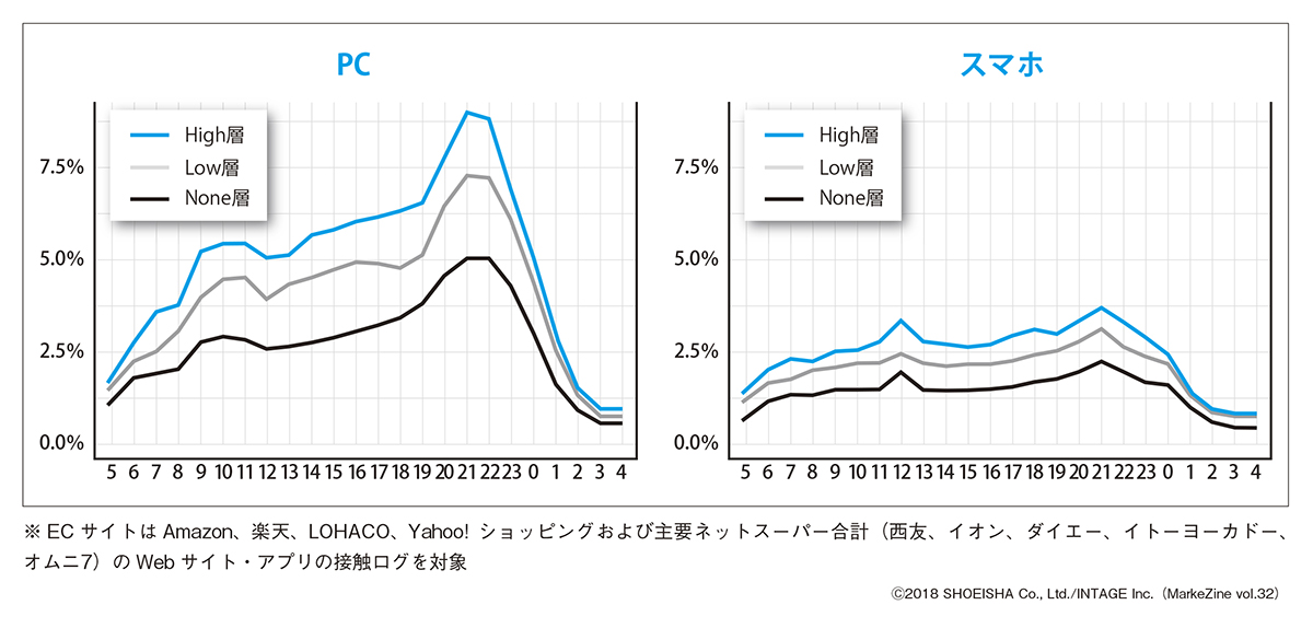 High層、Low層、None層(日用消費財をオンラインで購入しない層)を比べると、スマホとPCのいずれにおいても、High層、Low層、None層の順に利用率が高くなっています。日用消費財をオンラインで買っている人は、それだけECサイトも頻繁に利用していることがわかります。