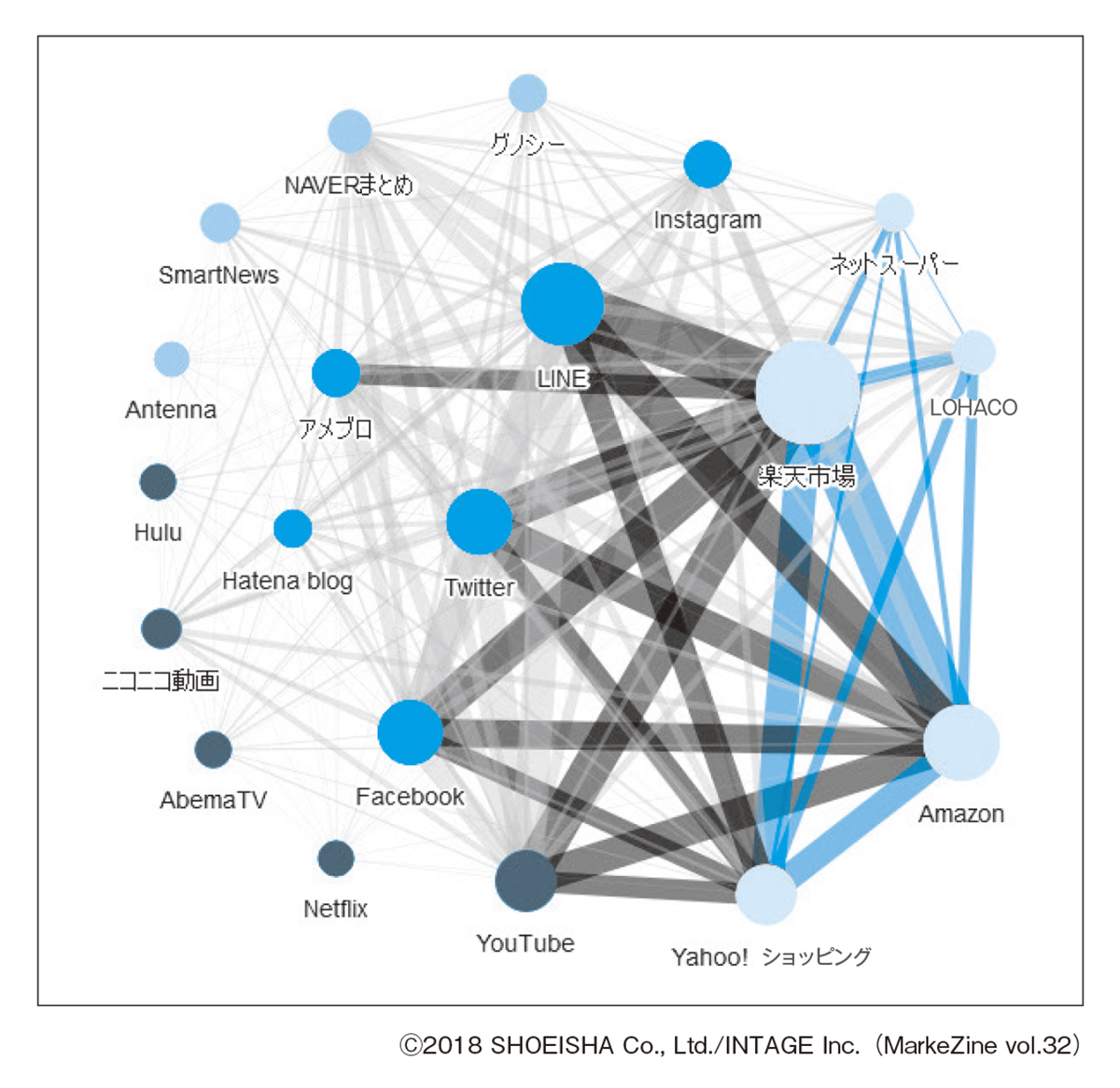 この分析では、サイトどうしの併利用のされやすさ(共起頻度)を線の太さによって表しています。たとえば、週単位でAmazonとTwitterを両方使っている人が多くいる場合、2つのサイト間の関係は強いと捉えられます。また、円の大きさは利用頻度の多さを表しています。