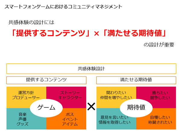 そして、共感体験を設計するには、「提供するコンテンツ」と「満たせる期待値」の掛け合わせが求められます。「提供するコンテンツ」は、ゲームの運営方針やキャラクター、ストーリー、起用する声優、イベントなど様々です。一方「満たせる期待値」には、仲間を増やしたい、運営と関わりたい、自慢したい、勝ちたいなど、ゲームを通じてお客様がどうありたいのかという姿が入ります。