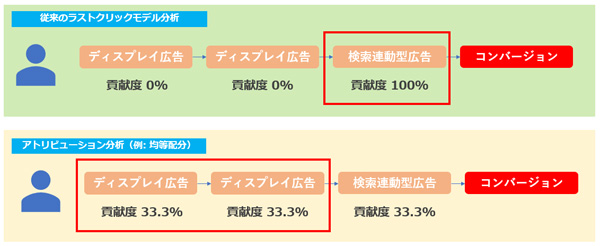 そもそもディスプレイ広告の役割というのはコンバージョンだけを追求するものではないはずだ、ディスプレイ広告にコンバージョンをアシストする間接効果があるとするならば、それを可視化して本当のディスプレイ広告の価値を測るべきだ、という流れからアトリビューション分析が登場してきました。