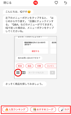 そのため最初は、クイックリプライと呼ばれるボタン表示(下画像赤枠内)から、人気ランキングやおすすめコーディネートを探すという設計を中心にしていました。しかし、思った以上にお客様がフリーワードを入力して検索することがわかり、リリース初期は質問の50%程度しか答えられていませんでした。