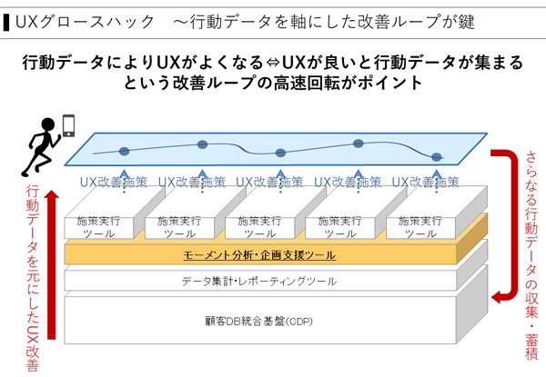 有園:誰かが困っているタイミングはほかの人も困っているだろうから、そのモーメントを分析するんですね。今の行動データから課題を見つけて解決するとビジネスも成長する……というのは、御社が推進する概念でもある「UXグロースハック」といえますか?