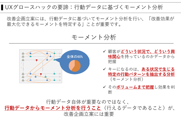 中島:そう、UXグロースハックのいちばんのボトルネックは企画立案なんですよ、これはまだ当分AIではできそうにない。となると、人力ならなるべく企画数を少なく精度高くすべきなので、行動データからボリュームを取れる共通モーメントを見つけることが重要なんです。