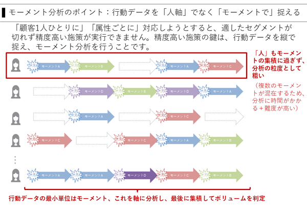 宮坂:One to Oneは実際、すごく大変ですよね。でもセグメントに分けると粒度が甘くなる。それより行動データが取れているなら、人を見るのをやめて、モーメントをしっかり発見して施策を打つ方向へ転換したほうが、企画効率が高くなる。
