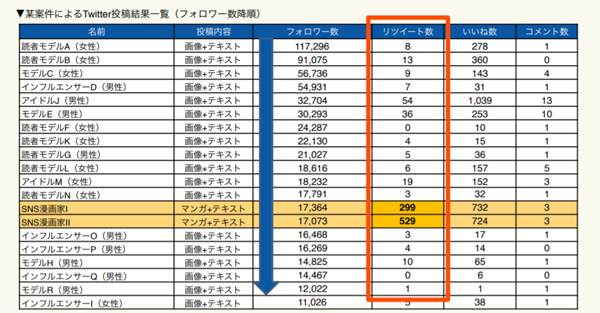 中川:ある案件で、読者モデルやアイドル、インフルエンサーといった方々と、当社のSNS漫画家をそれぞれ起用し、同時にプロモーションを行ったことがあります。その結果、SNS漫画家は、フォロワー数が劣る場合でも、特にリツイート数(=拡散)が圧倒的な結果となりました。