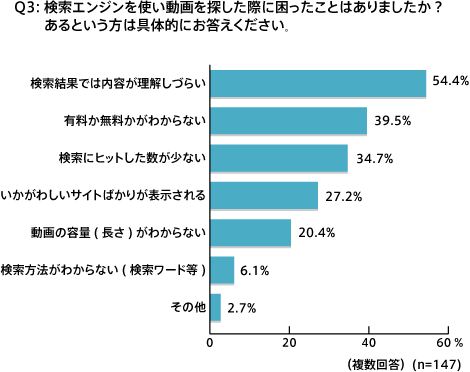 Q3では、Q2で検索エンジンを使い動画を探したことがあると回答した147人に対して、検索エンジンを使い動画を探した際に困ったことがあったかを尋ねた。その結果、「検索結果では内容が理解しづらい」と回答したユーザーが54.4%でもっとも多くなった。次いで、「有料か無料かがわからない」が39.5%、そして「検索にヒットした数が少ない」の34.7%が続く結果となった。