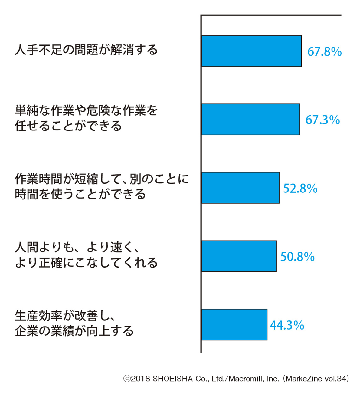 図表4はAIの導入で期待することを、ランキングで示したものである。最も期待されていたことは「人手不足の問題が解消する(68%)」であった。そして、ほぼ同じ割合で「単純な作業や危険な作業を任せることができる(67%)」が続いた。やはり労働力の確保という問題意識は強いようだ。