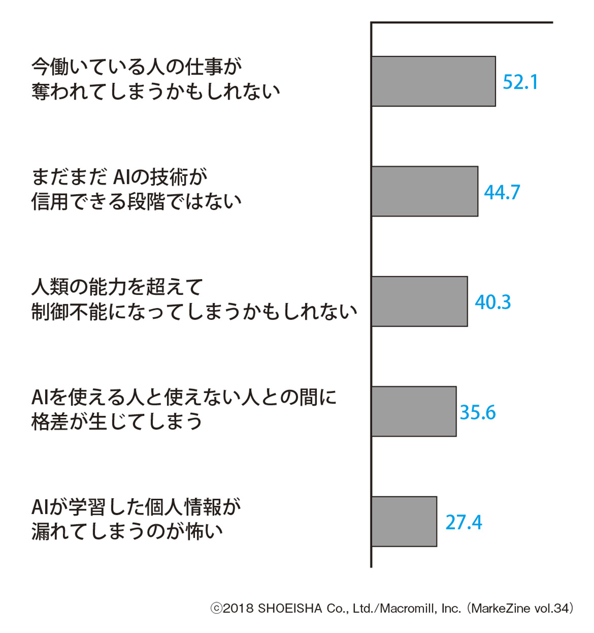 AIはまだ新しい技術であり、今後どこまでビジネスの中で活用されるようになるのかはわからない。まだ誰も経験したことのない社会へと転換していく可能性があるため、不安を感じる人がいたとしても当然である。図表5はAIの導入で心配なことを、ランキングで示したものである。約半数の人がAIの導入によって「今働いている人の仕事が奪われてしまうかもしれない」と、雇用の喪失を心配している。