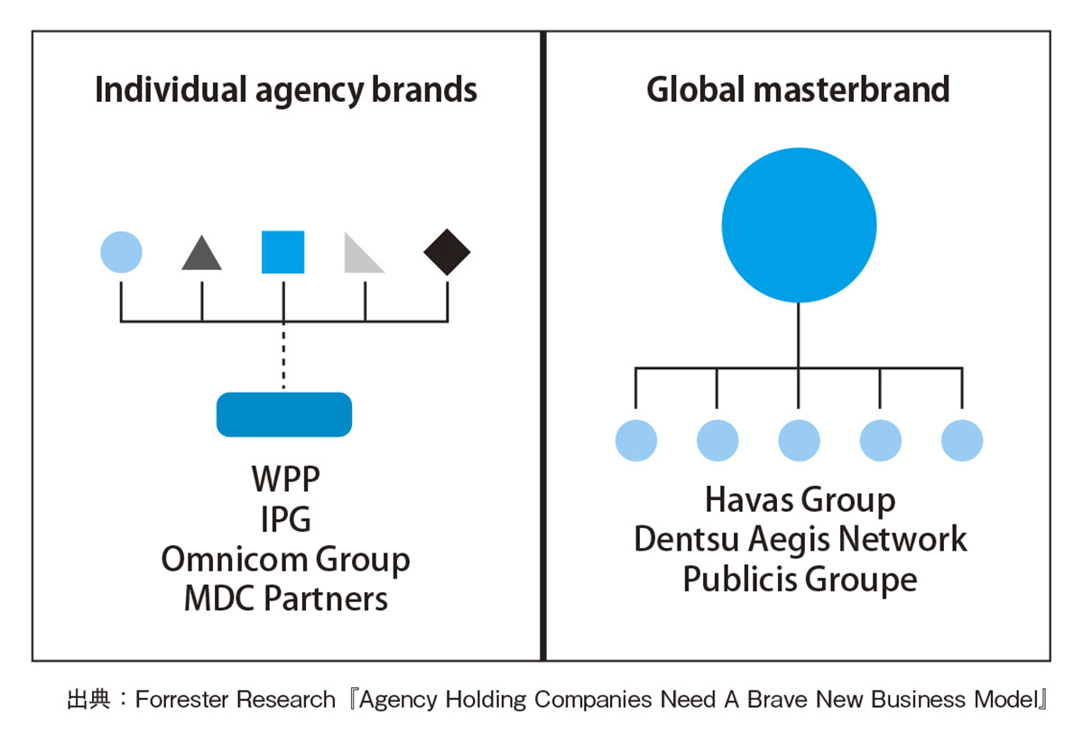 グローバル広告ホールディングスの体制は、「Individual agency brands」と「Global masterbrand」の大きく2つに分かれる(図表2)。