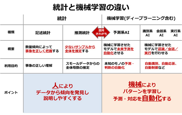 繰り返しになるが、機械学習は機械による”自動化”だ。一方で統計は人によるデータ傾向の発見と説明であることを考えると、共通用語や共通のメソッドがあったとしても、そもそもの成り立ちの違いをご理解いただけるのではないかと思う。