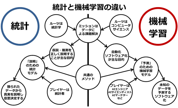 もちろん機械学習が登場したからと言って、統計の必要性がなくなるわけではない。これからも限られたデータから真実を説明し、意思決定の精度を上げていく役割は絶対的なものとして残るはずだ。一方で、未知のデータを予測するソフトウェアをビジネスの中にインストールしていく場合は、自動化を前提とした機械学習がその主たるキー概念になるのだろう。