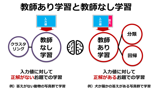 AIの学習の主要な種類としては教師あり学習と教師なし学習の二つがある。この二つは学習用データのあり方の違いで説明するのがわかりやすい。まず教師あり学習の学習用データだが、AI用の学習データの入力値に対して答えがセットで用意されている状態となる。たとえば写真画像を入力値とした場合、その写真が犬なのか猫なのかなど、答え付きのセットデータになる。