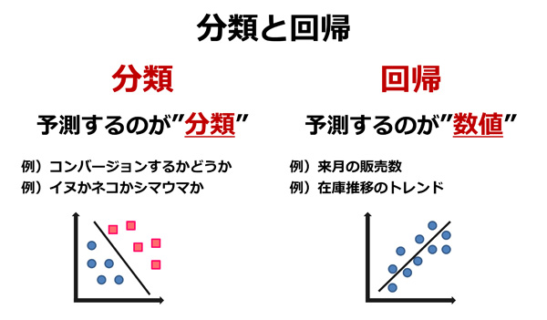 教師あり学習には大きく二つの種類がある。分類と回帰である。分類は、たとえばあるユーザーをコンバージョンする、コンバージョンしないかの予測で二つに分類したり、写真を入力して写っているのが犬なのか猫なのか馬なのかを判定するといった感じだ。分類は二分類でも三分類でも、分類数はいくつでもかまわない。回帰は、数値を予測するタイプの学習となる。たとえば来月の販売数や在庫数の日別のトレンド予測などである。