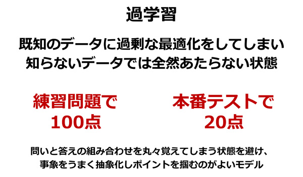 AIにおける学習において、プロジェクトを進めていくと、過学習という課題に向き合わなければならなくなることが多々ある。過学習とは、学習データの状態・コンディションや学習のさせ方等によって偏った学習を行ってしまうことだ。入力値(問い)と答えの組み合わせを丸々覚えてしまうような学習になってしまうことで過学習は生まれることがある。たとえるならば、練習問題を丸々暗記はするが、本番のテストで点数が取れないといった状態に近いと言って良い。