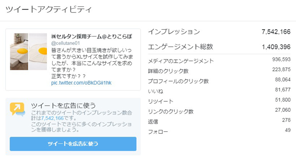 たとえば、以前バズらせることに成功したツイートでは、インプレッションに対する初動のエンゲージメント率が30%以上、「RT」は6%程度でした。最終的に数字が落ち着いた頃には、エンゲージメント率が18%程度にまで薄まりました。それだけ広く拡散されたということですね(下記図参照)。
