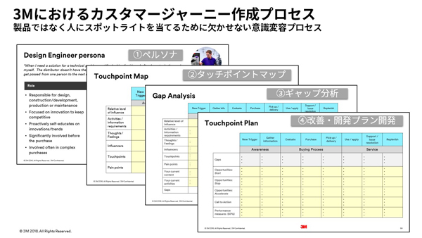 カスタマージャーニーマップは、まずペルソナ開発から始める。必要なときはカスタマーインタビューも行ってターゲットの業務を洗い出し、目標達成に必要なことを見出す。その次にタッチポイントマップを作成する。ターゲットになりきってその行動を一覧にし、3Mが実際にやっていることとのギャップを見つけ出す。