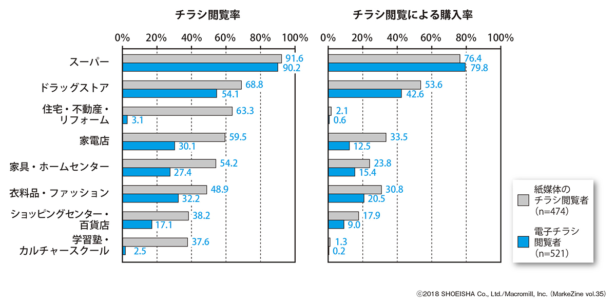 ベース:紙媒体チラシ閲覧者(n=474)、電子チラシ閲覧者(n=521)/複数回答