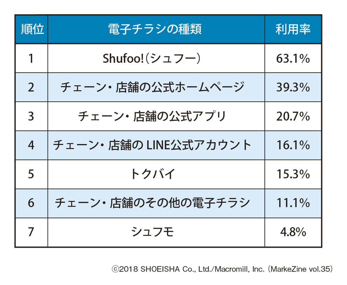 利用率の高いものから「Shufoo!(シュフー)」、「チェーン・店舗の公式ホームページ」、「チェーン・店舗のアプリ」、「チェーン・店舗のLINEアカウント」という順であった。Shufoo!は、トクバイやシュフモといった同様のサービスに圧倒的な差をつけており、電子チラシ業界の中心となっていると言っても過言ではないだろう。