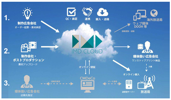 次に、指定されたCM素材に対して制作会社・ポスプロより、詳細なメタデータや素材ファイルが支給されます。これらの情報は一度事業者のシステムを介して業界標準のテレビCMオンライン送稿システム「CMDeCo」へ登録されるようになっており、オンライン送稿される素材が登録された内容と一致しているかを確認する「オンライン認証」機能を担います。媒体扱い広告会社はオンライン認証を通過した素材に対してCMDeCoへオンライン送稿を指示し、事業者はその指示を基に放送局へ素材を搬入する仕組みです。
