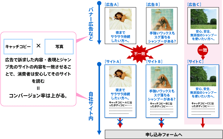 サイトの内容は、広告で訴求した内容と必ず一致させること。これは広告原稿を読んで熱の高まったユーザーを、見当違いのコンテンツで冷めさせないために重要である。