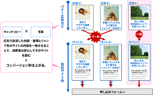 例えばバナーに特定のキャッチコピーや写真を入れた場合、必ずリンク先のキャンペーンサイトでもまったく同じキャッチコピーと写真を使用するべきである。消費者は広告をクリックして、その先のサイトが違う内容だったら、すぐに去ってしまう。広告原稿にあったキャッチコピーや写真があると、消費者は安心してそのサイトを読もうとする。もっと言うと、キャッチコピーや写真だけではなく、ボディコピー(本文)もキャッチコピーごとに合わせて若干調整する方が効果的と言える。