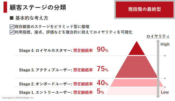 さらに顧客を、エントリー・オンボード・アクティブ・ロイヤルの4つのステージに分け、ロイヤリティを可視化し、アプローチを設計。このステージ分類によって、注力顧客やタスクの優先順位が明確となり、継続予想をもとにしたシンプルなCS活動を実現している。