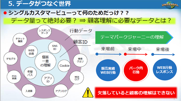 続いて、データドリブンマーケティング実現に向けたユー・エス・ジェイの取り組みが紹介された。まずはデータの定義だ。「データ量は多ければいいのか」と疑問を持っていた柿丸氏は「顧客理解に必要なデータとは何か」を考え始めた。そこでポイントとなったのが、テーマパークジャーニーの理解だ。