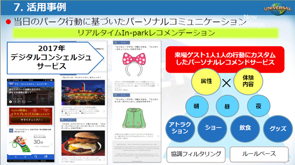2017年にリリースされた、デジタルコンシェルジュサービスは、当日のパーク行動に基づき、パーソナルコミュニケーションを行うもの。リアルタイムIn-parkレコメンデーションと呼び、協調フィルタリングと細かなルールベースで、来場ゲスト1人ひとりの行動に合った情報をアプリから提供している。