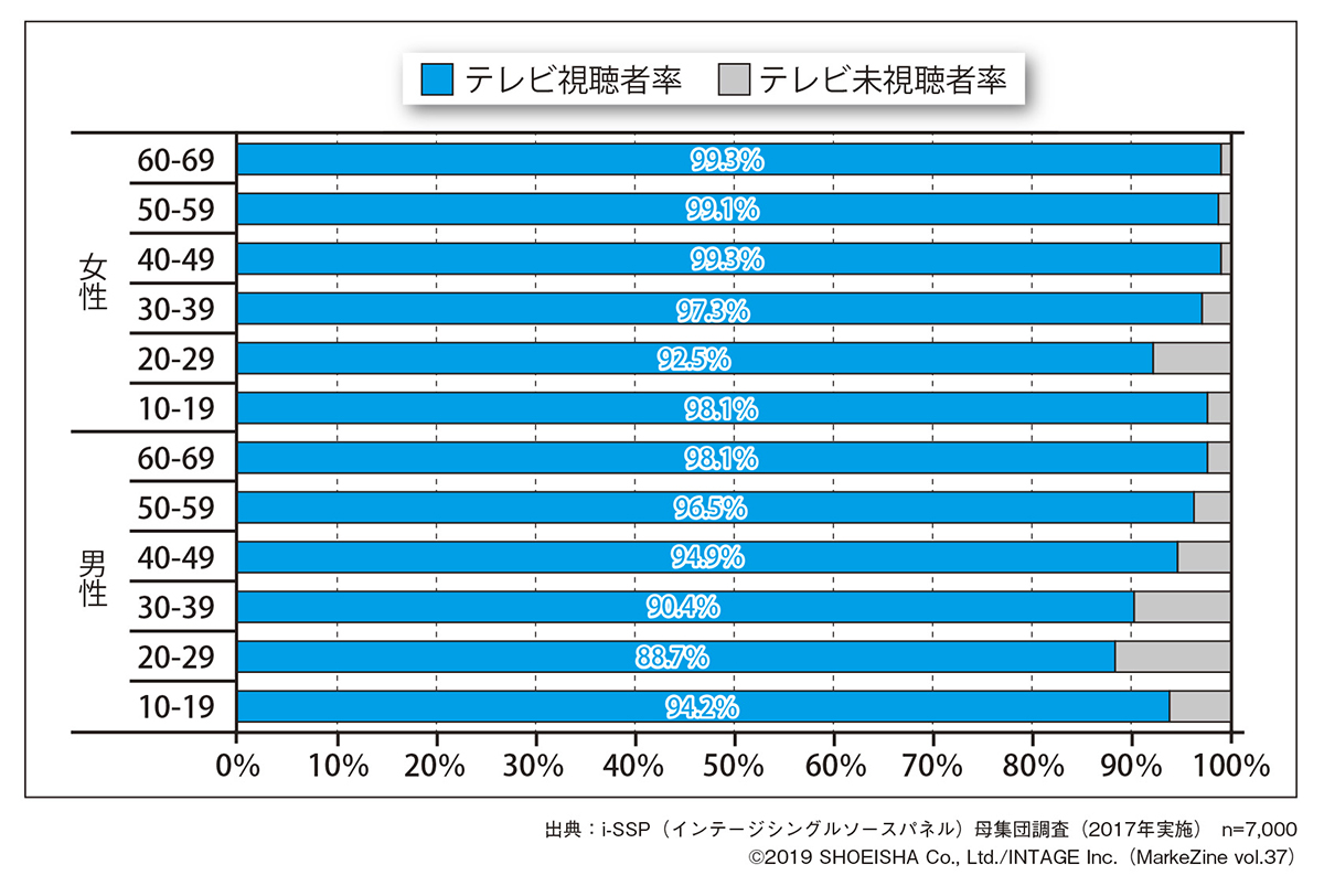 テレビ離れをしていると言われる若年層でも大多数が、いまだにテレビを視聴していることがわかります。約1割の「テレビを観ない」という層のみをターゲットとするのであればそこに向けたデジタル施策の実行は妥当ですが、現状、生活者の大多数を占めているテレビ視聴者に向けたマーケティングは不可欠でしょう。
