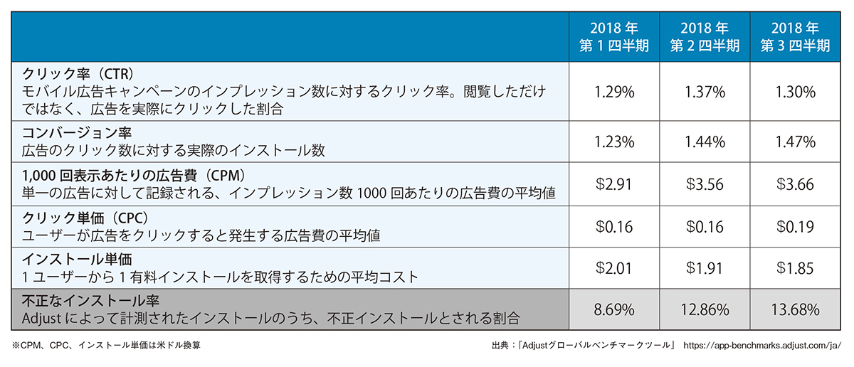 まず、ここ数年の現状を解説しますと、当社がグローバルで計測したアプリのインストールやイベントのデータ分析からは、不正の発生率は増加傾向にあることが明らかになっています。たとえば、2018年第1四半期(1〜3月)における不正なインストール率は8.69%でしたが、2018年第3四半期(7〜9月)には13.68%にまで増加しています(図表2)。