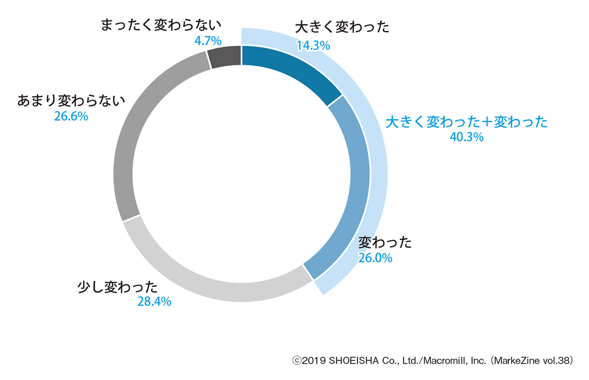 出品前提で商品を購入する・しないに関わらず、フリマアプリを利用するようになって生活の変化を実感している人はどの程度いるのだろうか。「大きく変わった」と「変わった」と回答した人は全体の40%で、「まったく変わらない」と回答した人はわずか5%。ほとんどの人が、少なからず生活の変化を感じていることになる(図表4)。